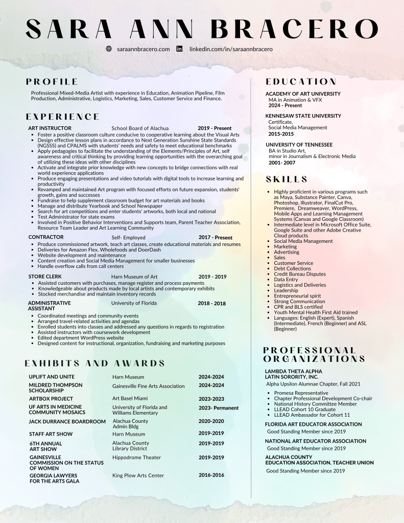 CV/ Resume Artist Resume Copyright © 2010-2025. The Art of Sara Ann Bracero, LLC. All Rights Reserved. Share this: Share on X (Opens in new window) X Share on Facebook (Opens in new window) Facebook Share on LinkedIn (Opens in new window) LinkedIn Share on Tumblr (Opens in new window) Tumblr Share on Pinterest (Opens in new window) Pinterest Like Loading...